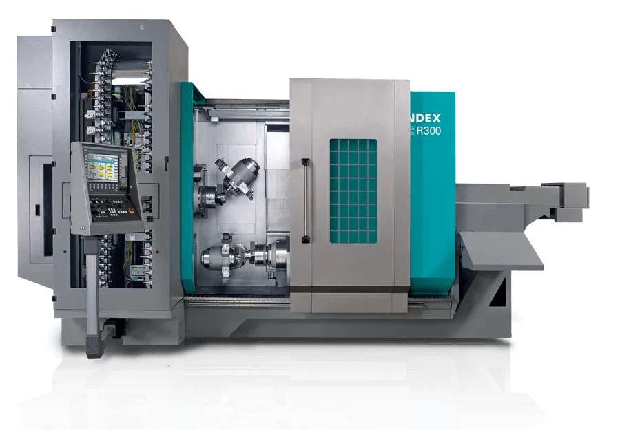 With the R series, INDEX is setting the standard for a new generation of turning/milling centers. Two motorized milling spindles perform machining in two independent sub-sysA new dimension in milling and turning RatioLine R300 tems, including 5-axis machining. Both heavy-duty roughing operations and highly accurate fine-turning operations can be performed simultaneously on the main spindle and counter spindle. This parallel use increases productivity significantly compared to conventional designs. New design solutions for optimum stiffness, thermal and dynamic stability, and vibration damping also provide for maximum machining quality.